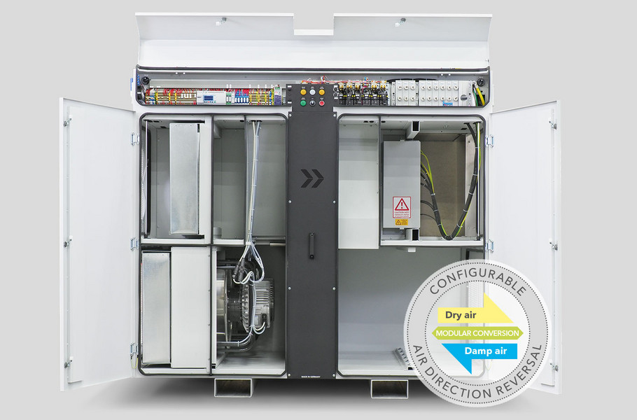 Ուղիղ կառավարվող բարձր արդյունավետությամբ EC օդափոխիչներ՝ ձեռքով արագության կարգավորմամբ՝ ինտեգրված պատյանում (հավելյալ շնչափող փականներ չեն պահանջվում), առանձին՝ պրոցեսի և վերականգնման օդի համար։