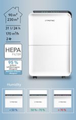 - Combined dehumidifier with HEPA air purifier (95% effective HEPA filtration of bacteria, viruses, pollen, fine dust, dust mites, mould spores, and other allergens and pollutants)