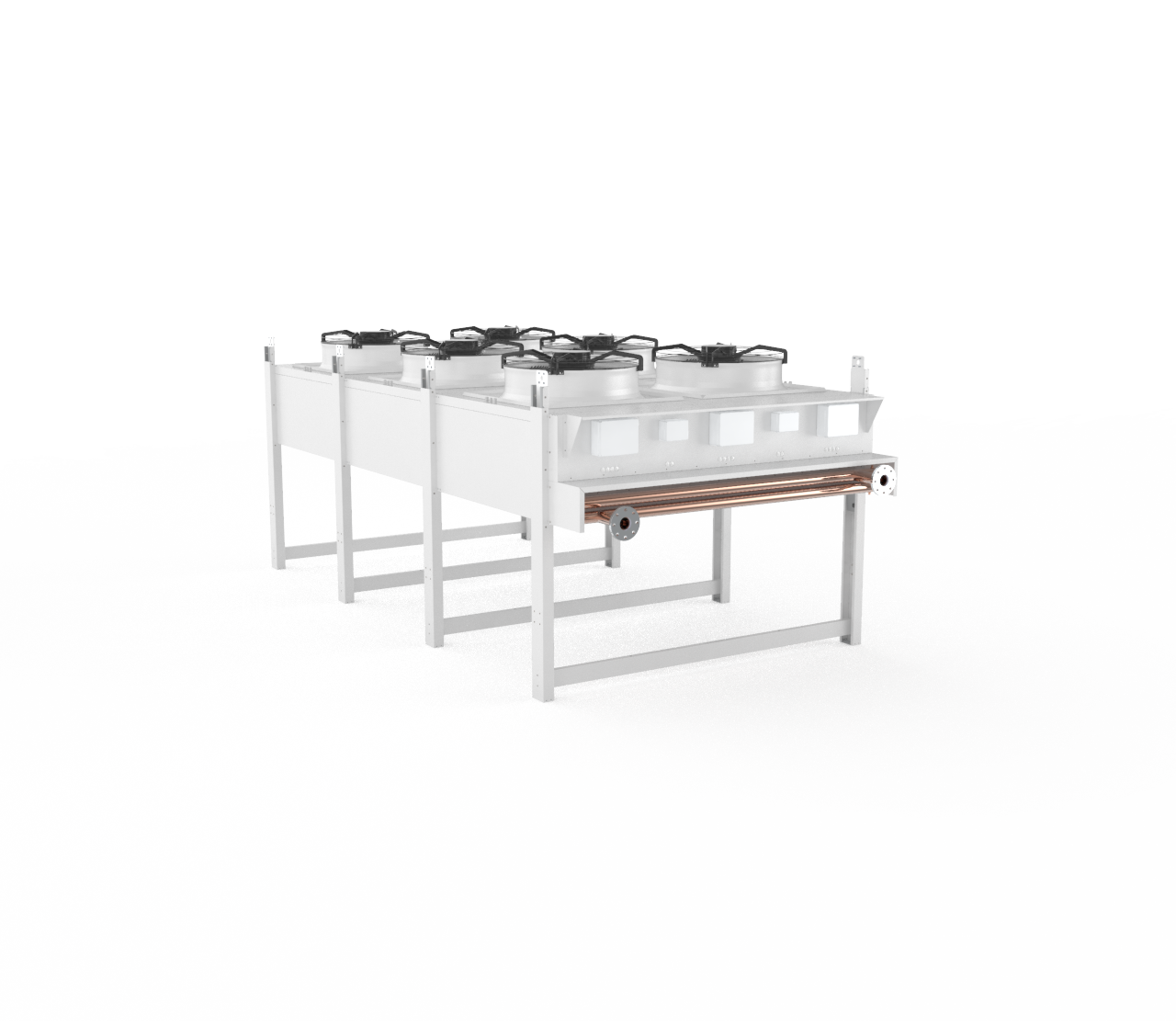 Finned coil: Built with Ø12mm copper tubes and turbulent aluminium fins. Designed with ‘Floating pack system’, which allows the coil to be suspended to avoid leaks