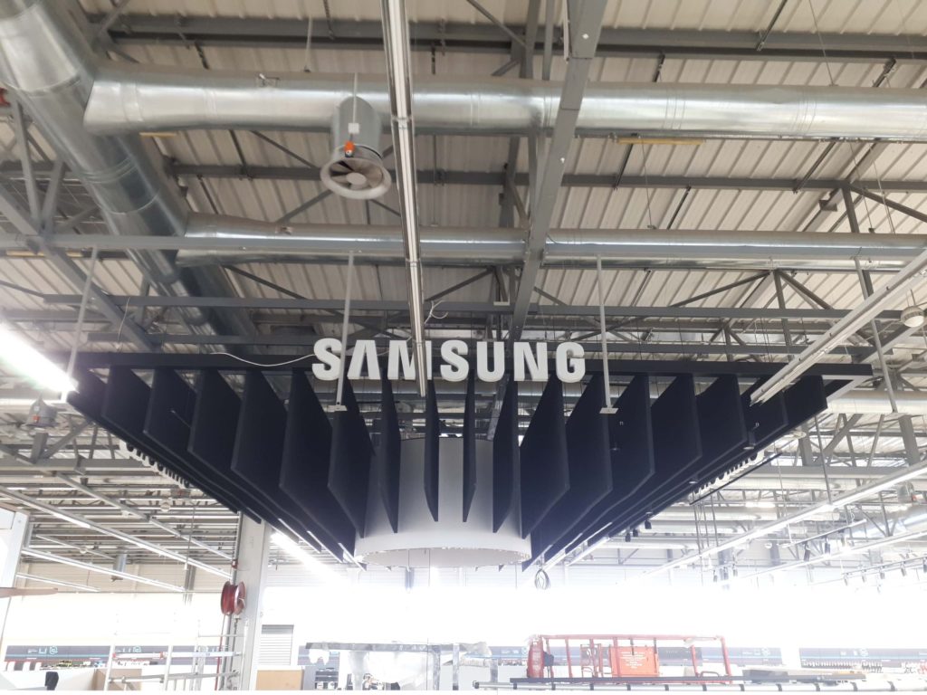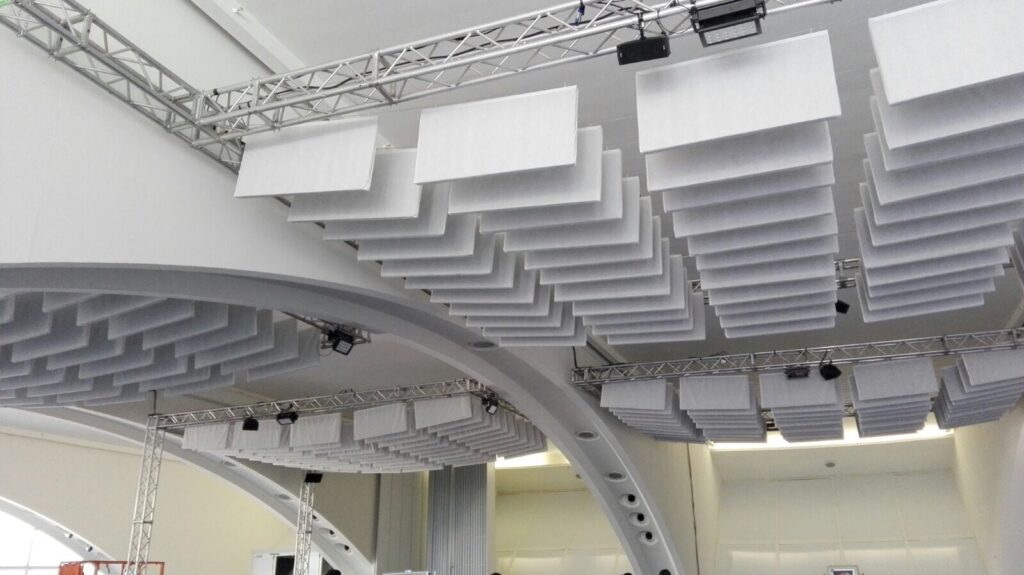 Они подвешиваются вертикально к потолку параллельными линиями, как определено соответствующим акустическим исследованием.