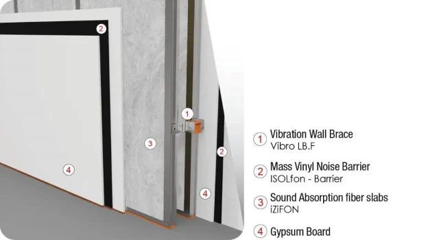 Использование антивибрационных кронштейнов Vibro-LB.F рекомендуется для стен из сухой конструкции с достаточно большой высотой более 2,5 метров. Целью использования этой антивибрационной системы является повышение динамической жесткости стеновой системы. Это ограничивает передачу нежелательной вибрации на структурную часть здания.